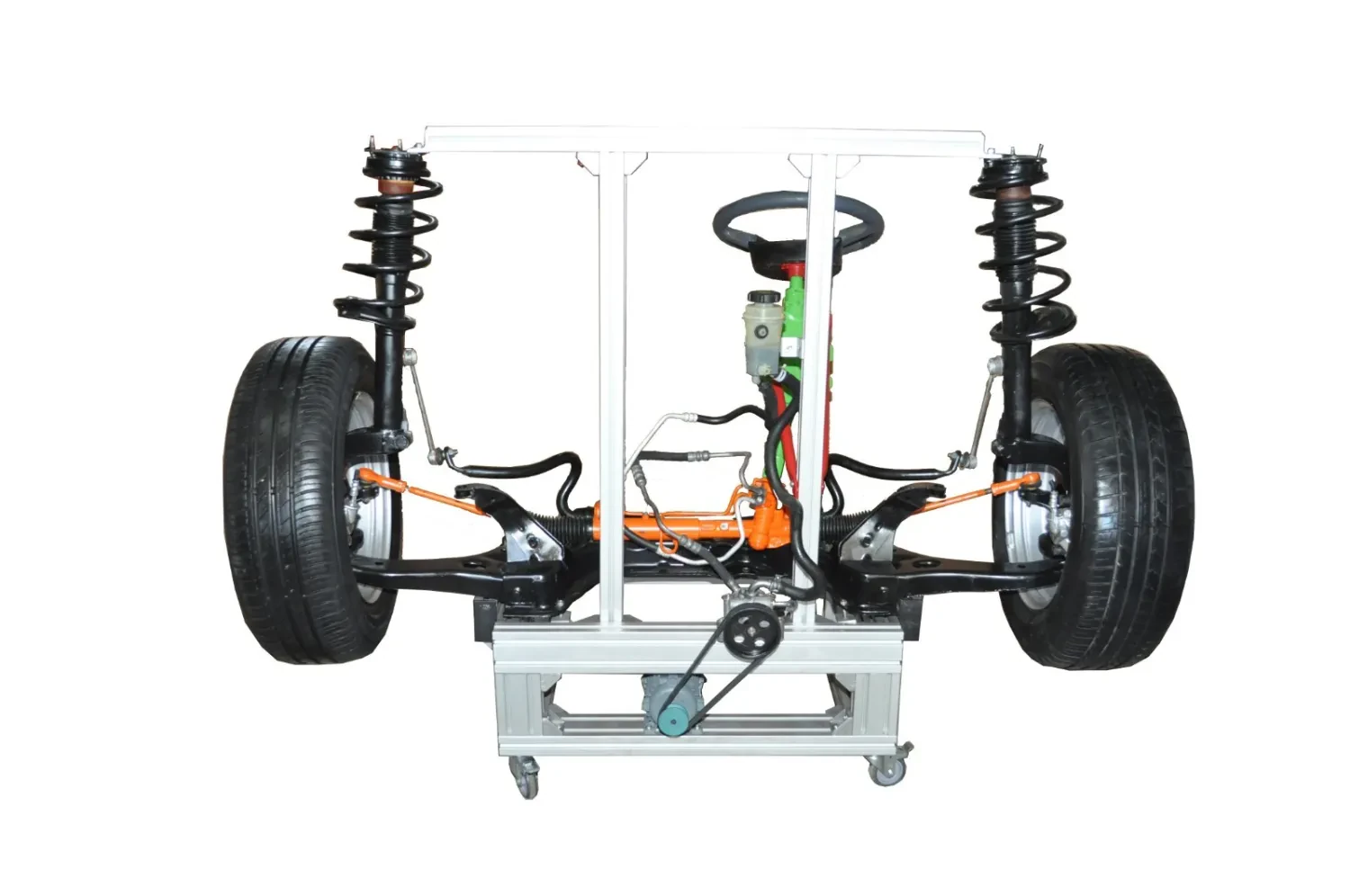 Gerçek hidrolik direksiyon ve süspansiyon sistemi simüle edilebilmektedir. Süspansiyon ve direksiyon sisteminin teknik çalışması ve fonksiyonlarını uygulamalı olarak eğitimini sağlayan deneysel yapıdadır. Sistemdeki ekipmanlar ve sistemin işleyişi her açıdan gözlemlenebilmektedir. Tamamen uygulamaya yönelik olarak hidrolik direksiyon ve süspansiyon sisteminin orijinal ve güncel parçaları kullanılarak çalışır durumdadır. Deney paneli üzerindeki yazı, tanımlar ve semboller kazıma metodu ile yapılmaktadır. Sistemin konumlandırıldığı platform, tekerlekli, ikisi sabit, ikisi hareketli ve kilitlidir. Panelin tamamı paslanma çizilmelere karşı dayanıklı materyallerden oluşmaktadır. Kullanıcının güvenliği ön planda tutularak tasarlanmıştır