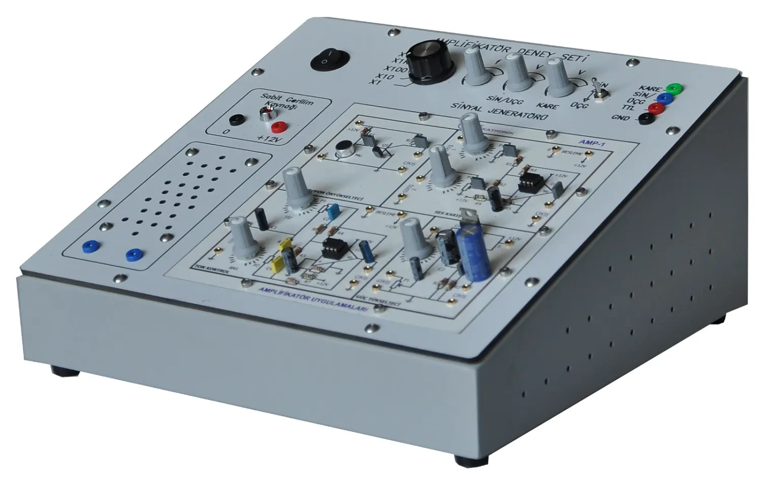 Amplifikatör Eğitim Seti, deney esnasında uygulamaları pratik bir şekilde yapmak için hazır modüller bulunmaktadır. Masaüstü kullanıma uygun yapıdadır. Bağlantılar 2mm dişi titanyum-altın alaşımlı metal soketler ile sağlanmıştır. Bağlantı kabloları 2mm yaylı altın kaplamadır. Set dayanıklı materyallerden oluşturulmuştur. Amplifikatör Eğitim Seti, ses yükselteç sistemlerinde bulunan tüm özelliklere sahiptir. Harici olarak verilen herhangi bir sinyali başlangıcından hoparlör çıkışına kadar inceleme olanağı sağlar. Set STEREO yapıdadır.