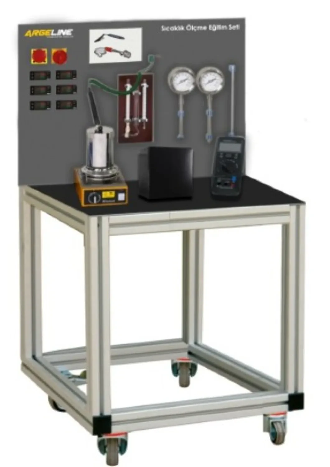 Sıcaklık ölçme eğitim seti elektrikli sıcaklık sensörleri, otomasyon uygulamalarında en yaygın kullanılanlardır, ancak geleneksel termometre türleri hala birçok alanda yaygın olarak kullanılmaktadır. Bu eğitim seti deneysel kurulum, tüm sıcaklık ölçüm yöntemlerini kapsar. Gaz ve sıvı dolu termometreler ve bimetalik termometreler gibi elektriksel olmayan ölçüm yöntemlerinin yanı sıra, tüm tipik elektrik ölçüm yöntemlerini içermektedir. Elektriksel olarak ölçülen sıcaklıklar doğrudan programlanabilir dijital ekranlarda görüntülenir. Sıcaklık orantılı bir çıkış voltaj sinyaline (0… 10V) laboratuar jaklarından erişilebilir, bu da sıcaklık özelliklerinin örneğin bir plotter ile kaydedilmesini sağlar. Bağıl hava nemini ölçmek için iki termometreli bir psikrometre mevcuttur, termometrelerden biri kuru termometreyi ölçer. Islak termometre ıslak pamuklu bir bezle kaplanır ve buharlaşarak soğumayı ölçer. Sıcaklık farkı bağıl hava neminin belirlenmesine izin verir.Elektrikli ölçüm cihazlarını kalibre etmek için hassas dirençli bir dijital multimetre kullanılır. Çeşitli ısı kaynakları veya depolama birimleri (daldırma ısıtıcı, termos ve laboratuvar ısıtıcısı), test edilen sensörler için ilgili sıcaklık aralıklarının elde edilmesine izin verir.