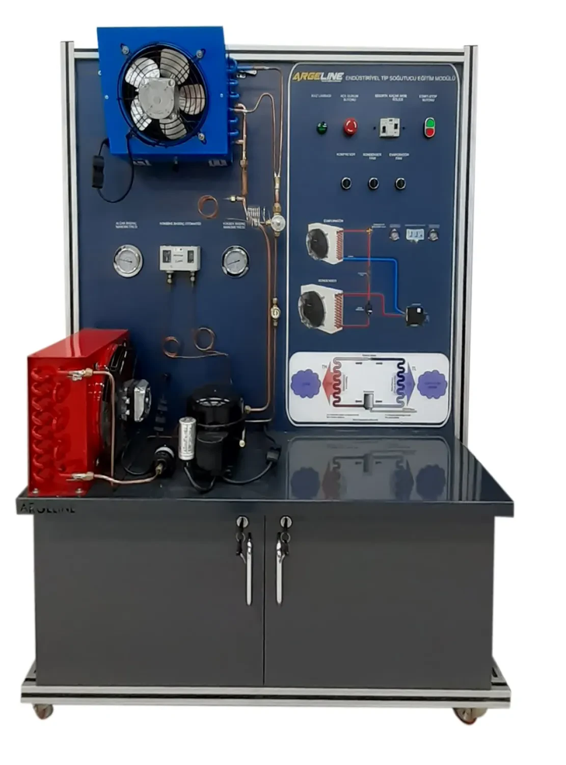 Temel soğutma çevriminin yapısı ve çalışmasının anlaşılması, çeşitli bileşenlerin işlevinin incelenmesi,muhtemel arızalar hakkında eğitim verilebilmesi için tasarlanmıştır. Sanal arızalar verilebilmektedir. Eğitim seti tüm bileşenleri ögencilerin sogutma sistemlerini kendileri montaj etmeleri açısından modüler olarak tasarlanmıştır.