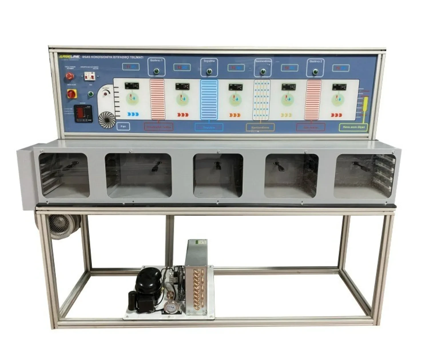 Deney setinde bir soğutma grubu, ısıtma işlemleri için rezistanslar ve bir de nemlendirme ünitesi vardır. Kullanılan havanın debisi devri ayarlanabilen bir radyal fan sayesinde ayarlanmaktadır. Havanın aktığı kanal sistemi yaklaşık 0,10 m 2 'lik kesit alanına sahiptir. Atmosferden emilen hava önce değişken hızlı bir santrifüj fana girer daha sonra ise kanal sisteminden geçer. Isıtma işlemleri sırasında nem içeriğini artırmak için nemlendirme ünitesi çalıştırılır. Isıtma işlemlerinde rezistanslar devreye girer ön ısıtma rezistans gücü 1 kW, son ısıtma rezistans gücü ise 0,5 kW değerindedir. Bu rezistanslar sayesinde hava ısıtılır. Sıcaklık ve nem sensörlerinden gelen bilgiler LCD ekrandan gözlemlenebilmektedir. Sistemden soğutulmuş ve nemi alınmış hava geçecek ise soğutma sistemi devreye alınır ve soğutma grubu ve kanal içi evaporatör vasıtası ile 3 kanaldan geçen havanın soğutulması sağlanır. Serin ve kuru hava kanaldan geçerken bu bölümdeki nem ve sıcaklık sensörleri ölçümlerini yapar. Eğer havanın tekrar ısıtılması isteniyorsa son ısıtma rezistansları çalıştırılmalıdır. Şartlandırılan hava atmosfere salınmadan önce hava hızı ölçer ile (anemometre) hız ölçümü yapılır.